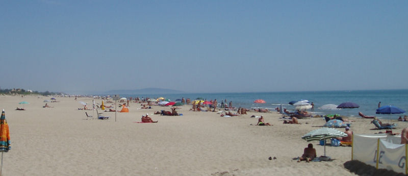 Der Strand ist feinsandig und fällt langsam ins Wasser ab. Unmittelbar vor der Anlage findet man den Familienstrand. Teilweise sind Parzellen durch große Windschützer abgeteilt. Hier kann man Liegen mieten und man bekommt die Getränke sogar an die Liege serviert. Dafür zahlt man aber auch ordentlich. Blickt man am Strand nach Rechts so sieht man in wenigen Metern die kleine Hafenmole mit der Einfahrt zum Hafen von CDA. Hier endet auch der FKK-Strand. Nach Links erstreckt sich der Strand kilometerweit. Nach wenigen hundert Metern wird die Dichte der Sonnenanbeter immer weniger, bis nach ca. 500 Metern der Schweinchenstrand beginnt. Man erkennt den Schweinchenstrand daran, dass dort die Leute sehr dicht zusammen liegen. Der Strand liegt unterhalb eines kleinen Strandrestaurants. In der Saison steht hier ein Polizeicontainer. An diesem Strand herrscht absolute sexuelle Freiheit. Hier gibt es alles, was man sich sonst nicht einmal vorstellen kann. Achtung : Leute mit Kindern und Jugendliche bleibt fern !!!