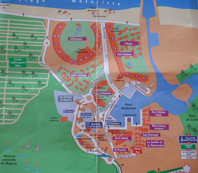 Wenn man Agde erreicht muß man sich immer Richtung “Le Cap d´Agde” und dann Richtung “Cartier Nuturist” halten. Man gelangt zum Eingang des NudistenCamps. Hier stellt man zunächst sein Fahrzeug ab und geht zur Kasse. Hier muss man entweder ein Tagesticket lösen ( 15 Euro) oder bekommt sein Ticket, wenn man vorher gebucht hat. Als Tagesgast kann man nur bis 20:00 Uhr in die Anlage und sollte sie auch bis dahin verlassen haben ( wird aber nicht kontrolliert ) Mit dem Ticket öffnet sich die automatische Schranke und man ist drin im Cap. Besucherparklätze findet man gleich hinter der Einfahrt auf der linken Seite, sonst zur gebuchten Unterkunft. Orientiert Euch einfach an der Karte oben.
